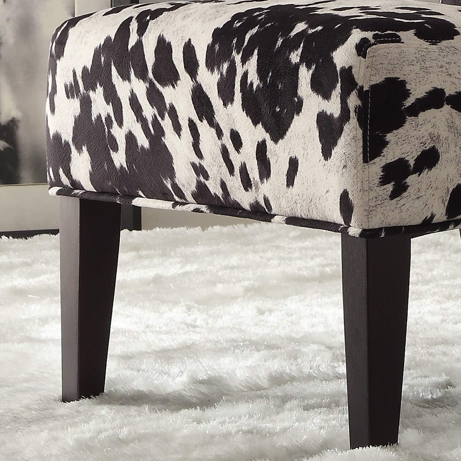 Elevate your decor with the Trea Cowhide Print Upholstered Accent Chair in Black & White, a statement piece that combines cutting-edge aesthetics with a touch of romantic charm. Designed to elevate any mixed motif room, this accent chair boasts a curvy frame and abstract black and white print on microfiber and leatherette upholstery for an energetic and inspiring look. With comfortable seating and espresso finish legs adding a touch of sophistication, the Trea accent chair is the perfect blend of style and comfort for any modern space.